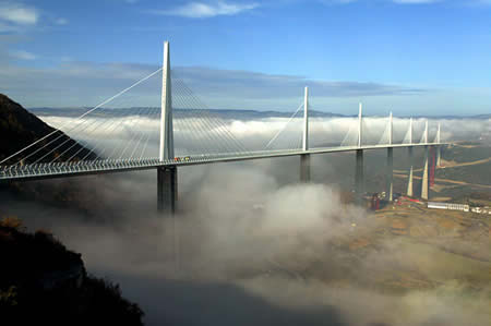 Menjulang tinggi di atas 1.125-ft Tarn Valley di selatan Perancis, mengemudi di sepanjang Jembatan Millau dikatakan merasa seperti terbang. Foster + Partners ini mengagumi sedikit lebih tinggi dari Menara Eiffel, waktu tiga tahun untuk membangun dan dibuka untuk umum pada tahun 2004. Walaupun mungkin menyediakan pemandangan indah lembah di bawah, setelah kabut turun itu bukan rute untuk menjadi lemah hati! The Millau Bridge memiliki total panjang 8.071-ft dengan span tunggal terpanjang di 1.122-ft dan maksimum di bawah izin dari 886-ft; di jembatan pendek adalah mengesankan secara besar-besaran baik di atas kertas dan dalam kehidupan nyata. Geladak adalah lofted pada 7 pylons dan beratnya 36.000 ton. Serangkaian dari 7 tiang-tiang, masing-masing 292-kaki tinggi dan berat 700 ton, yang melekat pada tiang yang sesuai.